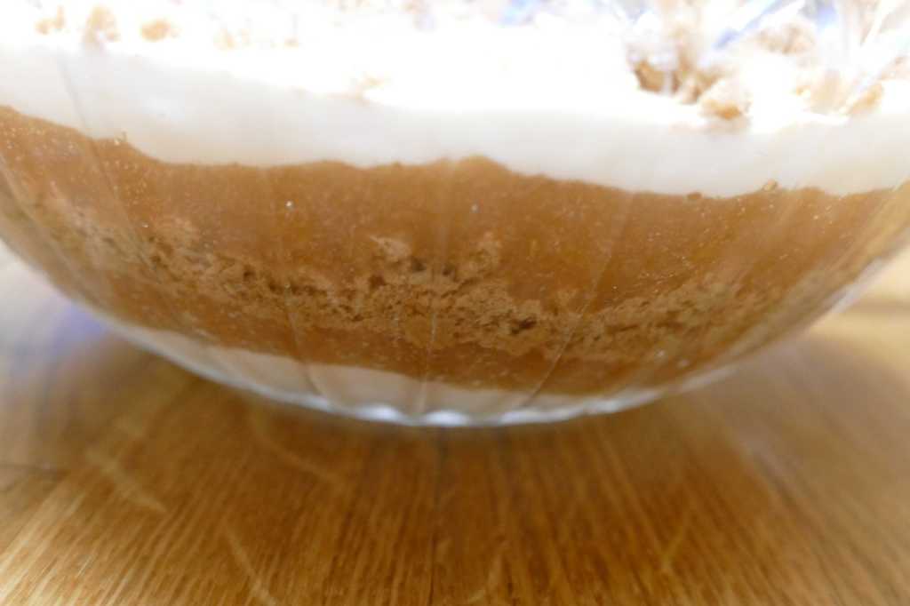 Die Spekulatius in einen Gefrierbeutel füllen. Mit einem Nudelholz zerkleinern. 3/4 der Spekulatiusbrösel auf die Apfelmus-Schicht geben (die Schicht sollte ebenfalls 1-2 cm dick sein). Dann erneut 1-2 cm dick Apfelmus darauf verteilen. Die restliche Quarkcreme darauf streichen und mit den restlichen Spekulatius-Bröseln bestreuen.