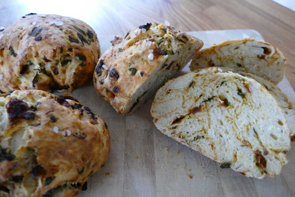 Die Tomaten fein hacken und den Bärlauch in Streifen schneiden. Zum Teig geben und kneten, bis sich alles gleichmäßig eingearbeitet hat.
