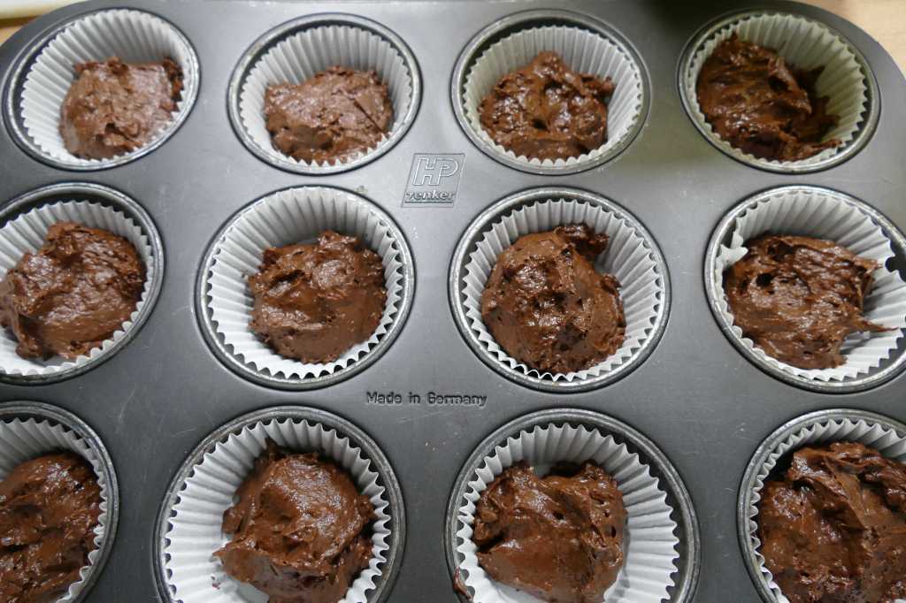 Eine Muffinform mit Papierförmchen auslegen und den Teig einfüllen.