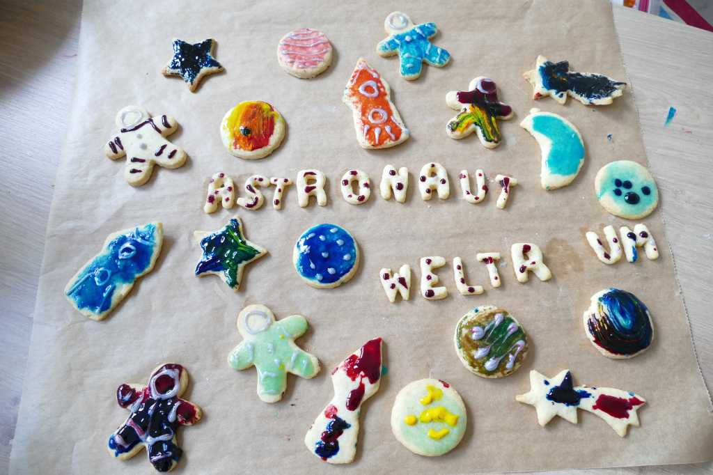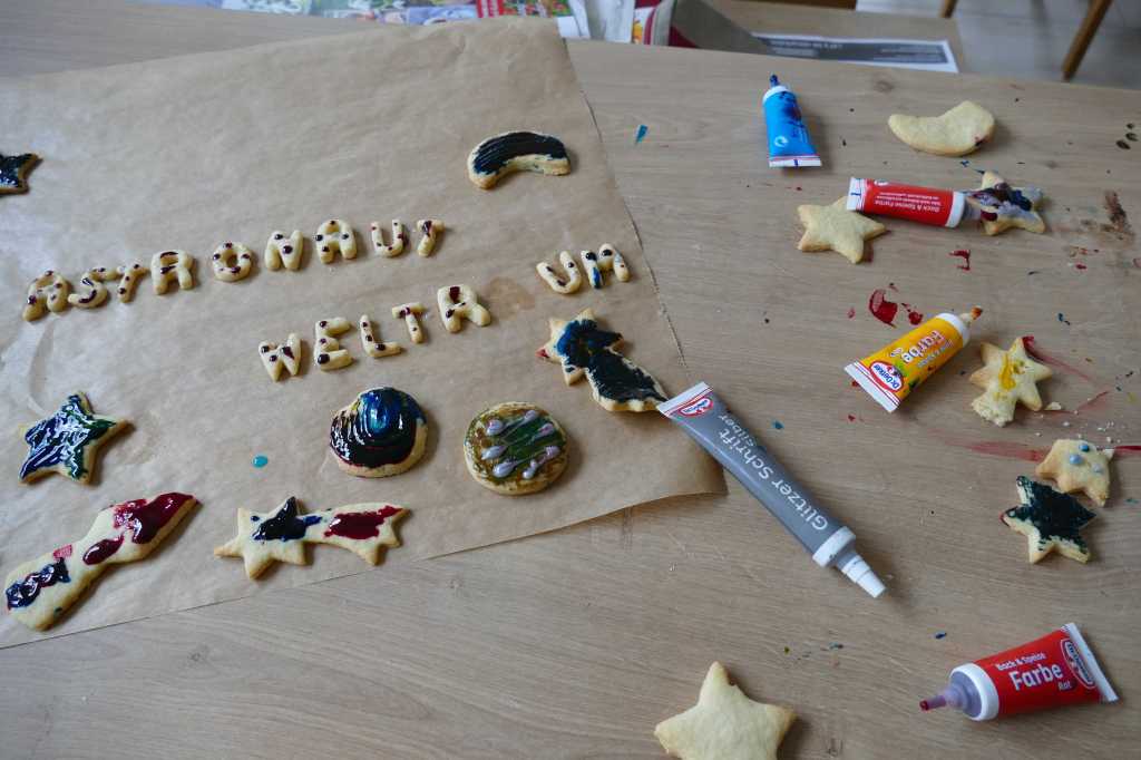 Den Teig mit Löffeln auf ein mit Backpapier ausgelegtes Backblech platzieren und etwas plattdrücken. Genügend Platz zwischen den Teigklecksen lassen, sonst gibt`s einen großen Keks.